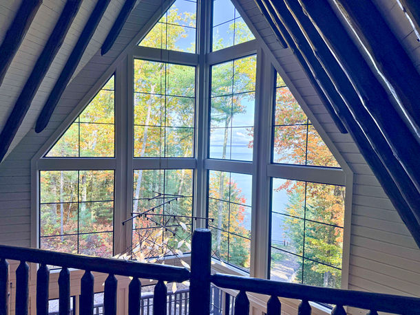 This A-Frame log home sitting up on a hill overlooking Burt Lake features Marvin Ultimate Windows, Swinging French Door, and Sliding Patio door